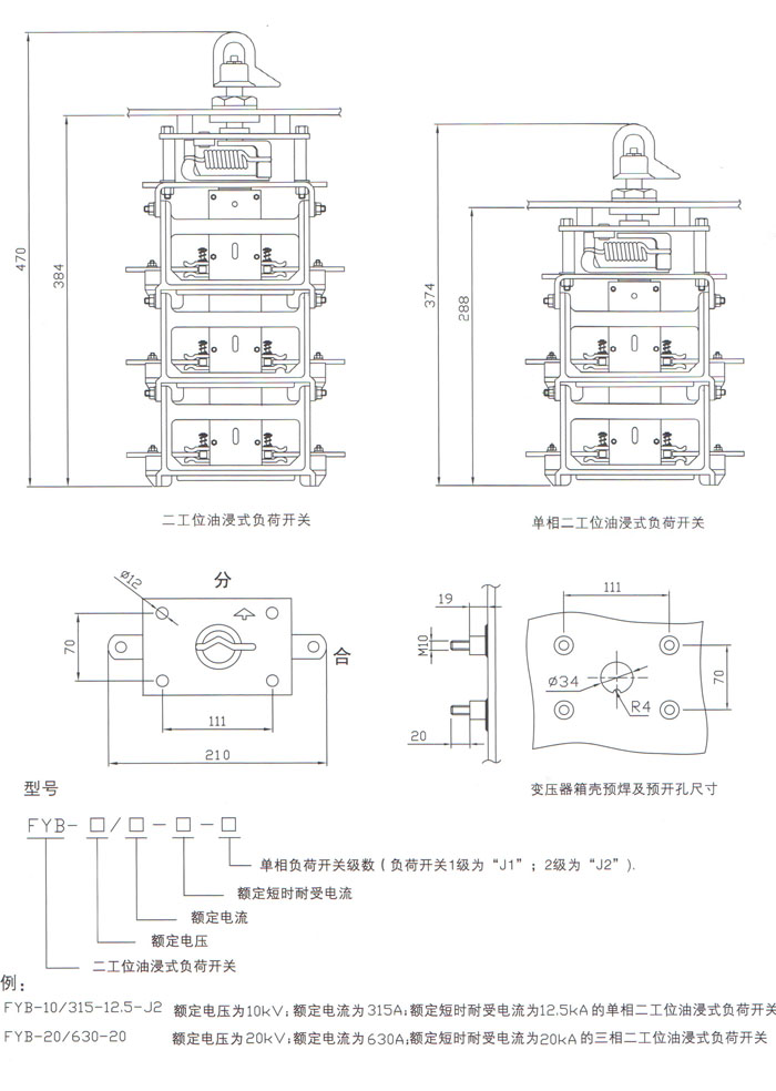 FYB-10型二工位油浸式负荷开关是安装在组合式变压器内,以变压器油作为绝缘和灭弧介质的三相联动开关。操作机构为弹簧贮能装置,开关具有切断和闭合两个工位。根据开关的不同配置可分别适用于10KV终端型和环网型的配电系统。