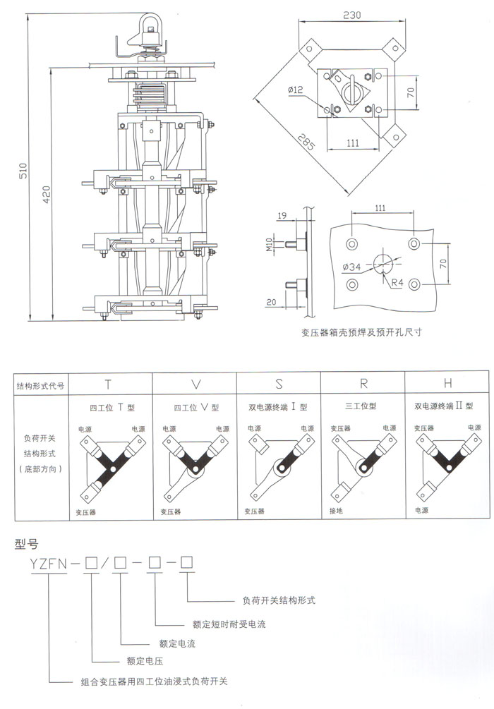 YZFN10~20型油浸式高压转换负荷开关是安装在组合式变压器内,以变压器油作为绝缘和灭弧介质的三相联动开关。操作机构为弹簧贮能装置,开关具有电源A、电源B、环网和断开四个工位。负荷开关分为T型和V型,适用于10KV环网或双电源配电系统。